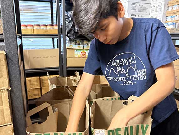 As part of our servant-leadership program, City School partners with organizations for volunteer opportunities for our students. Our seventh and eighth grades volunteer at the Impact Now Dove Springs Food Pantry and Community First Village on a regular basis, serving and building relationships in our broader Austin area community.